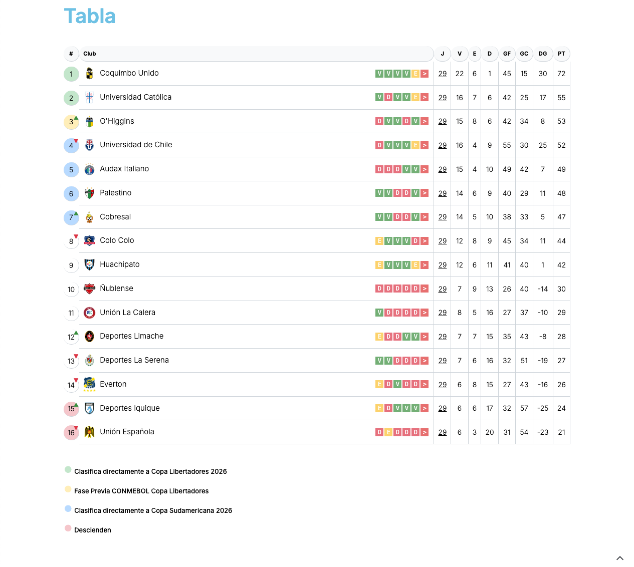 En un duelo directo por la clasificación a la Copa Sudamericana, el equipo de Gustavo Huerta fue contundente y superó con claridad al Cacique con goles de César Munder (2) y Diego Coelho. Colo Colo mostró serias falencias defensivas, quedó en el octavo lugar con 44 puntos y ya no depende de sí mismo para clasificar a un torneo internacional en 2026.
