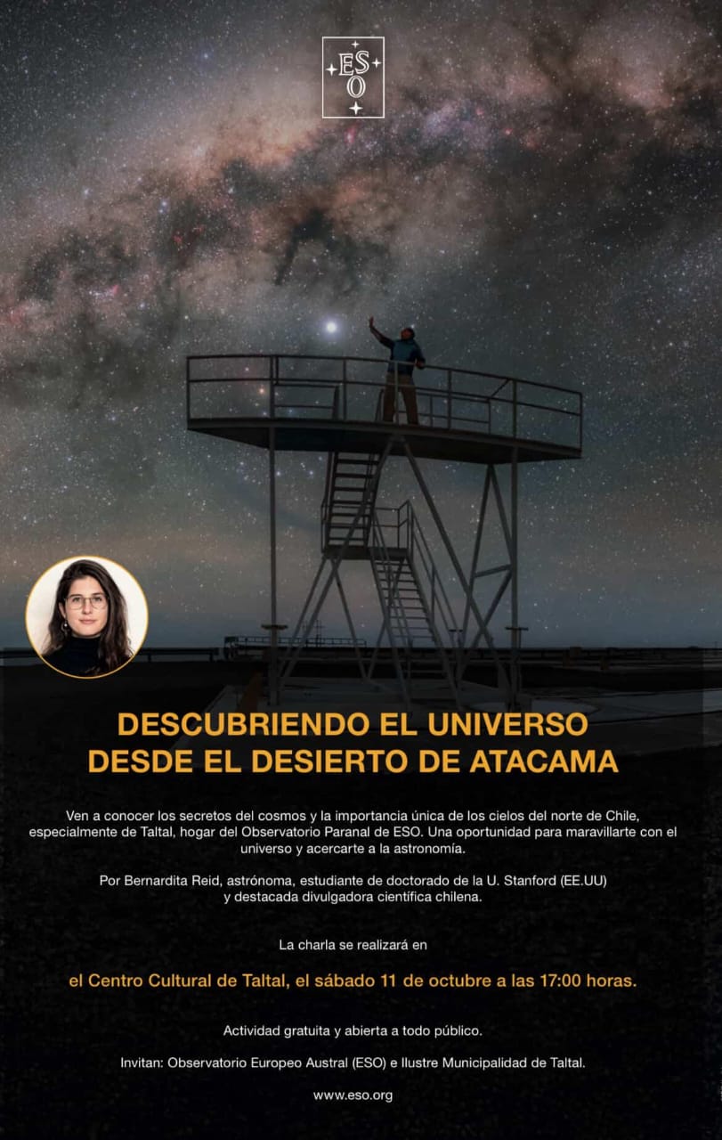TALTAL — jueves, 09 de octubre de 2025. Este sábado 11 de octubre, a las 17:00 horas, el Centro Cultural de Taltal será escenario de una imperdible charla astronómica gratuita organizada por ESO Paranal en conjunto con la Ilustre Municipalidad de Taltal. La actividad contará con la participación de la astrónoma chilena Bernardita Reid, quien invitará a la comunidad a descubrir la importancia científica y natural de los cielos del norte de Chile.