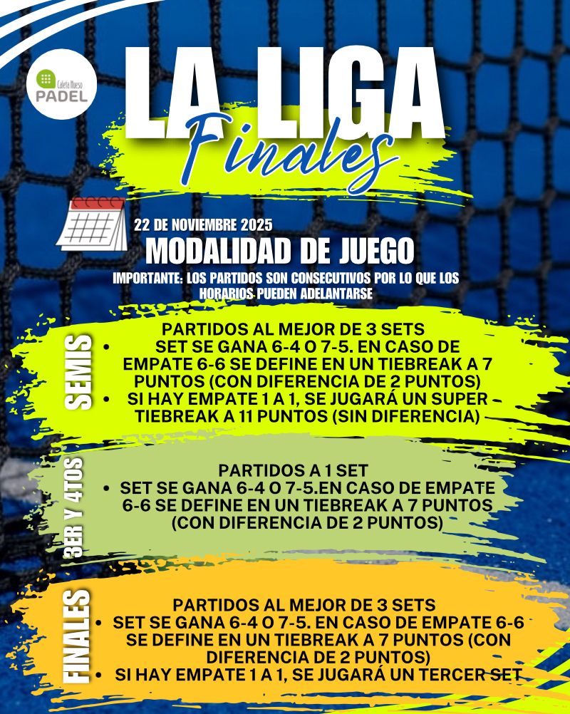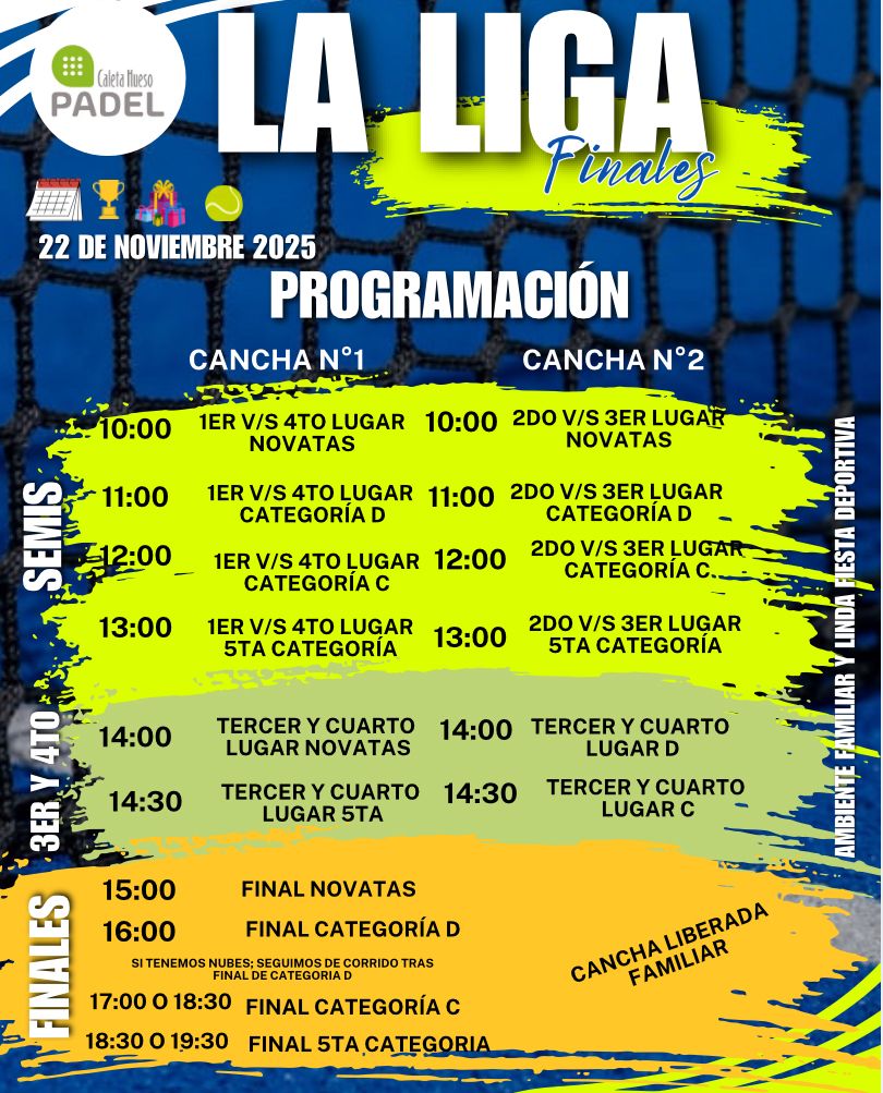 Este sábado 22 de noviembre, Caleta Hueso Pádel realizará las finales de La Liga 2025, instancia que reunirá a las categorías Novatas, D, C y 5ta, incluyendo encuentros decisivos, duelos de alto nivel técnico y la participación de las y los mejores exponentes del club.