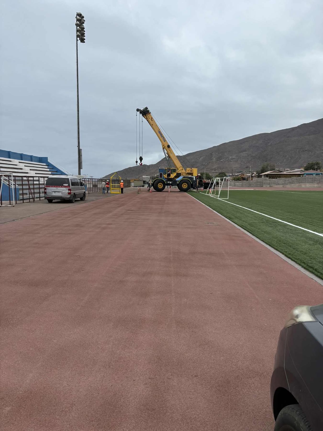 Grúa municipal instala luminarias de alta potencia en el Estadio Belmor Rojas Iriarte de Taltal para mejorar la infraestructura deportiva.