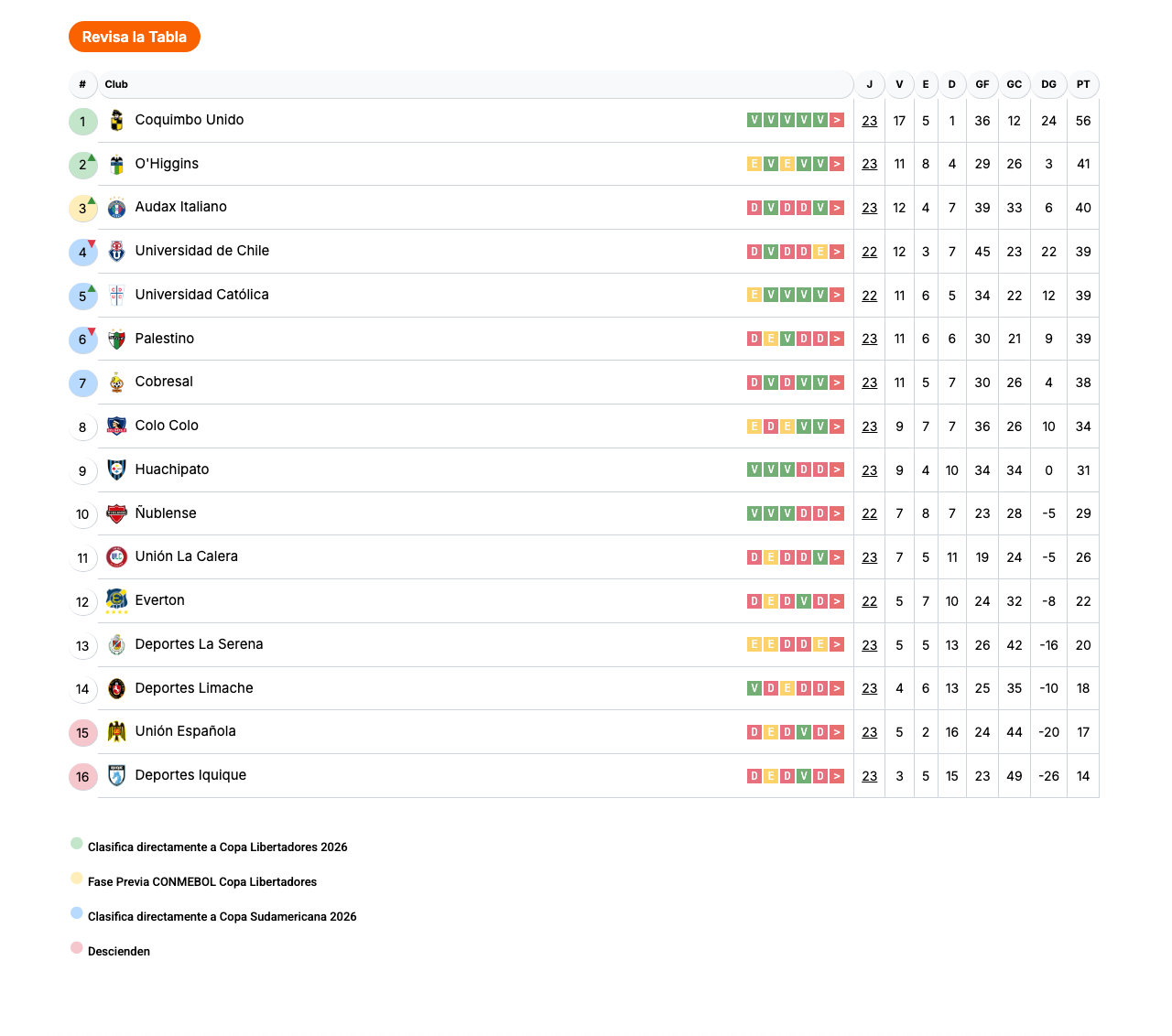 - Universidad de Chile: Con este resultado queda 4° con 39 puntos y deberá recibir a Palestino en el Estadio Nacional el 19 de octubre a las 18:00 horas, obligado a sumar para no hipotecar incluso su clasificación internacional con Lanús el día 23 del mismo mes.
